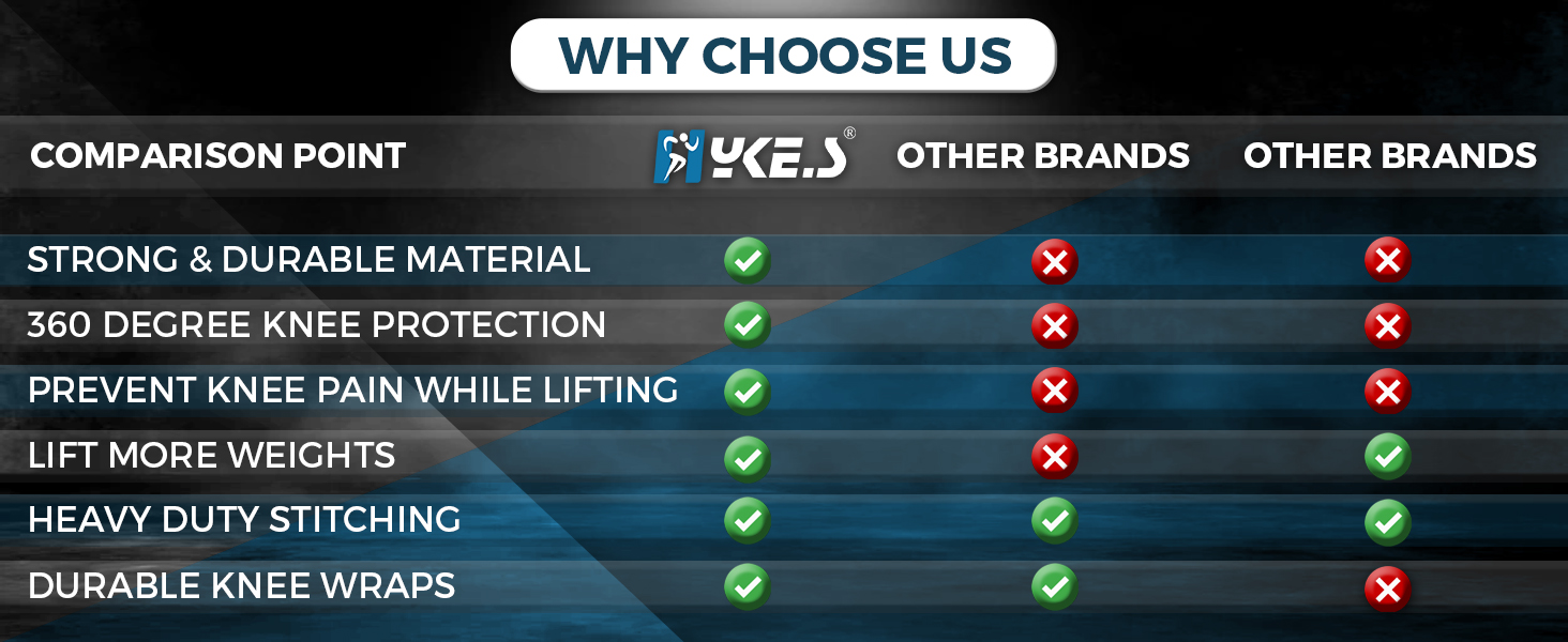 PREMIUM QUALITY MATERIAL Our Hykes Knee Wraps are made of High-Quality Cotton Material. Its strong Hook and Loop closure provides a Firm Grip to knee joints during training.