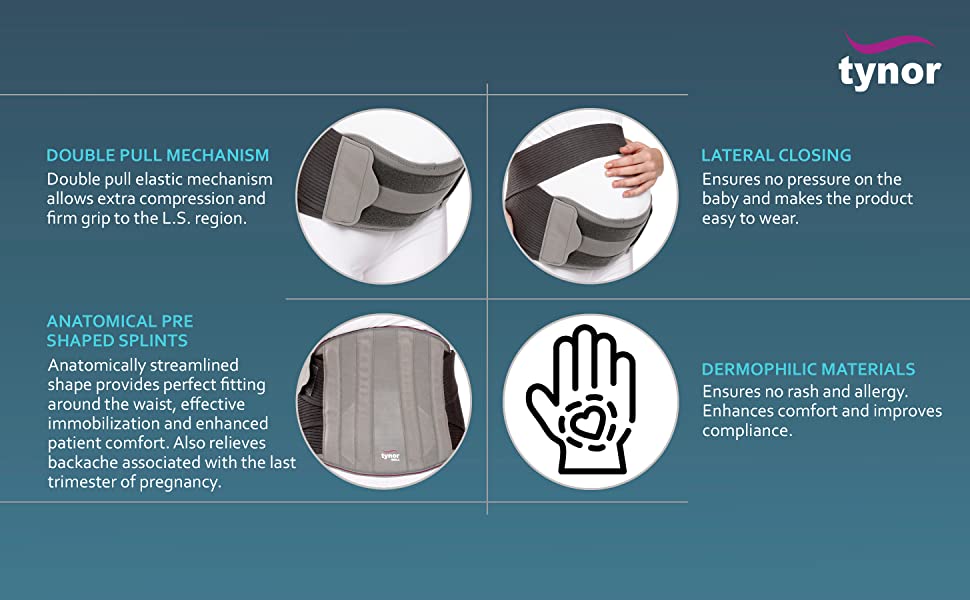 Tynor pregnancy back support offers the advantage of advanced designing and technically correct materials to provide the pregnant mother, effective support and immobilization on one hand and excellent aesthetics and comfort on the other. Pregnancy back support maintains the lumbo sacral region in the neutral position to allay
