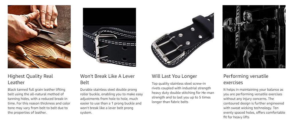 - WHEN QUALITY MEETS COMFORT: All of our suede weight lifting belts measure 4 inches and have just about the right size so as facilitate your training to the fullest. The double reinforced stitching, riveting underpinning and ultra resilient oil leather craftsmanship, guarantee that this waist belt can withstand some heavy duty use.