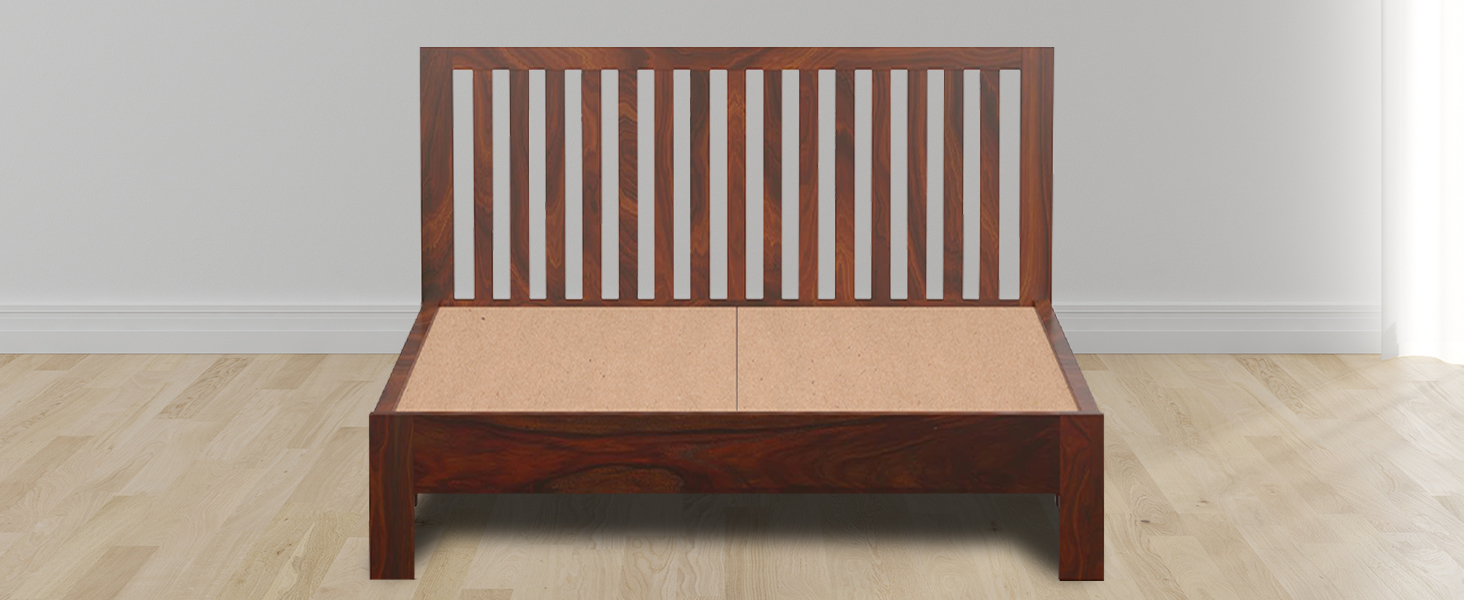 - Material: Sheesham Solid Wood with a premium teak finish. Mattress support is MDF board